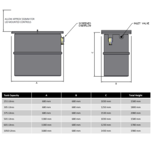- Tank capacity sized for approx. 135 litres storage per person per day.
