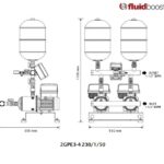 2GPEH 3-4 Twin pump variable speed Duty / Stand-by booster set incorporating WRAS approved stainless steel horizontal multi-stage pumps fitted with 0,65kW 230/3/50 motors and complete with motor mounted intelligent variable speed drive & pressure transducer, 2 no. 8 litre pressure vessels, pressure gauge, isolating valves for suction & delivery and non return valve fitted to delivery connected to common 1-1/2″ bsp(m) inlet & outlet stainless steel manifolds.