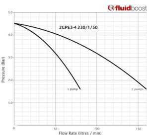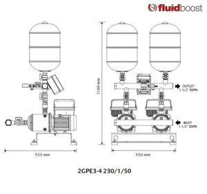 2GPEH 3-4 Twin pump variable speed Duty / Stand-by booster set incorporating WRAS approved stainless steel horizontal multi-stage pumps fitted with 0,65kW 230/3/50 motors and complete with motor mounted intelligent variable speed drive & pressure transducer, 2 no. 8 litre pressure vessels, pressure gauge, isolating valves for suction & delivery and non return valve fitted to delivery connected to common 1-1/2″ bsp(m) inlet & outlet stainless steel manifolds.