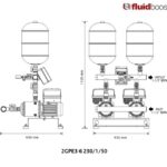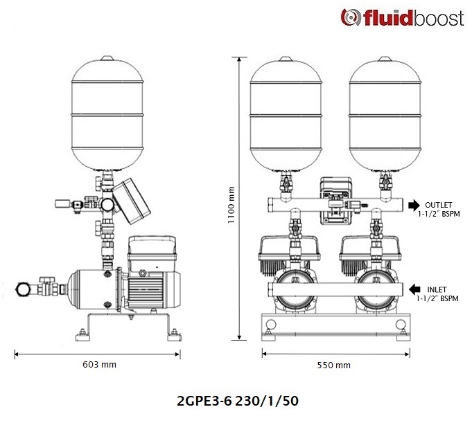 2GPEH 3-6 Twin pump variable speed Duty / Stand-by booster set incorporating WRAS approved stainless steel horizontal multi-stage pumps fitted with 0,9kW 230/3/50 motors and complete with motor mounted intelligent variable speed drive & pressure transducer, 2 no. 8 litre pressure vessels, pressure gauge, isolating valves for suction & delivery and non return valve fitted to delivery connected to common 1-1/2″ bsp(m) inlet & outlet stainless steel manifolds.