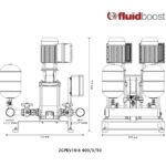 2GPEV 10-8 Twin pump variable speed Duty / Stand-by booster set incorporating WRAS approved stainless steel vertical multi-stage pumps fitted with 3,0kW 400/3/50 motors and complete with motor mounted intelligent variable speed drive & pressure transducer, 2 no. 8 litre pressure vessels, pressure gauge, isolating valves for suction & delivery and non return valve fitted to delivery connected to common 2-1/2″ bsp(m) suction & discharge stainless steel manifolds.