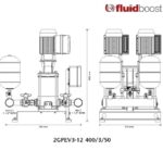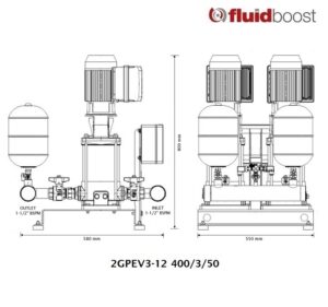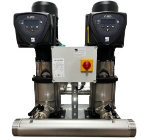 2GPEV 3-12 Twin pump variable speed Duty / Stand-by booster set incorporating WRAS approved stainless steel vertical multi-stage pumps fitted with 1,1kW 400/3/50 motors and complete with motor mounted intelligent variable speed drive & pressure transducer, 2 no. 8 litre pressure vessels, pressure gauge, isolating valves for suction & delivery and non return valve fitted to delivery connected to common 1-1/2″ bsp(m) suction & discharge stainless steel manifolds.