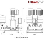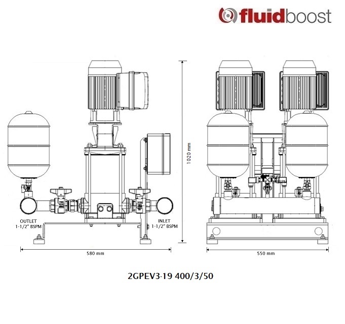 2GPEV 3-19 Twin pump variable speed Duty / Stand-by booster set incorporating WRAS approved stainless steel vertical multi-stage pumps fitted with 2,2kW 400/3/50 motors and complete with motor mounted intelligent variable speed drive & pressure transducer, 2 no. 8 litre pressure vessels, pressure gauge, isolating valves for suction & delivery and non return valve fitted to delivery connected to common 1-1/2″ bsp(m) suction & discharge stainless steel manifolds.