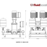 2GPEV 5-15 Twin pump variable speed Duty / Stand-by booster set incorporating WRAS approved stainless steel vertical multi-stage pumps fitted with 3,0kW 400/3/50 motors and complete with motor mounted intelligent variable speed drive & pressure transducer, 2 no. 8 litre pressure vessels, pressure gauge, isolating valves for suction & delivery and non return valve fitted to delivery connected to common 2″ bsp(m) suction & discharge stainless steel manifolds.