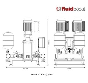 2GPEV 5-15 Twin pump variable speed Duty / Stand-by booster set incorporating WRAS approved stainless steel vertical multi-stage pumps fitted with 3,0kW 400/3/50 motors and complete with motor mounted intelligent variable speed drive & pressure transducer, 2 no. 8 litre pressure vessels, pressure gauge, isolating valves for suction & delivery and non return valve fitted to delivery connected to common 2″ bsp(m) suction & discharge stainless steel manifolds.