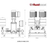 2GPEV 5-9 Twin pump variable speed Duty / Stand-by booster set incorporating WRAS approved stainless steel vertical multi-stage pumps fitted with 2,2kW 400/3/50 motors and complete with motor mounted intelligent variable speed drive & pressure transducer, 2 no. 8 litre pressure vessels, pressure gauge, isolating valves for suction & delivery and non return valve fitted to delivery connected to common 2″ bsp(m) suction & discharge stainless steel manifolds.