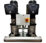Twin pump variable speed booster sets incorporating WRAS approved stainless steel vertical multi-stage pumps with motor mounted intelligent variable speed drives, which continually vary the motor speed to match the changing demand and maintain a constant supply pressure to all outlets.